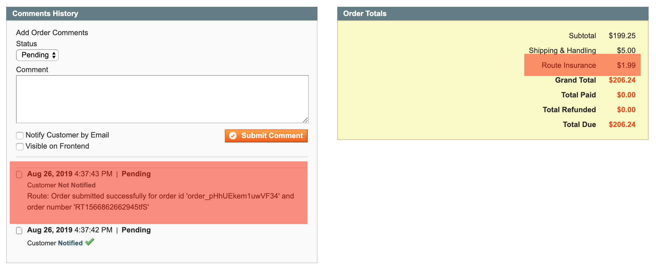 You can check if an order was placed using Route Insurance by navigating to Sales -> Orders and then selecting a specific order.